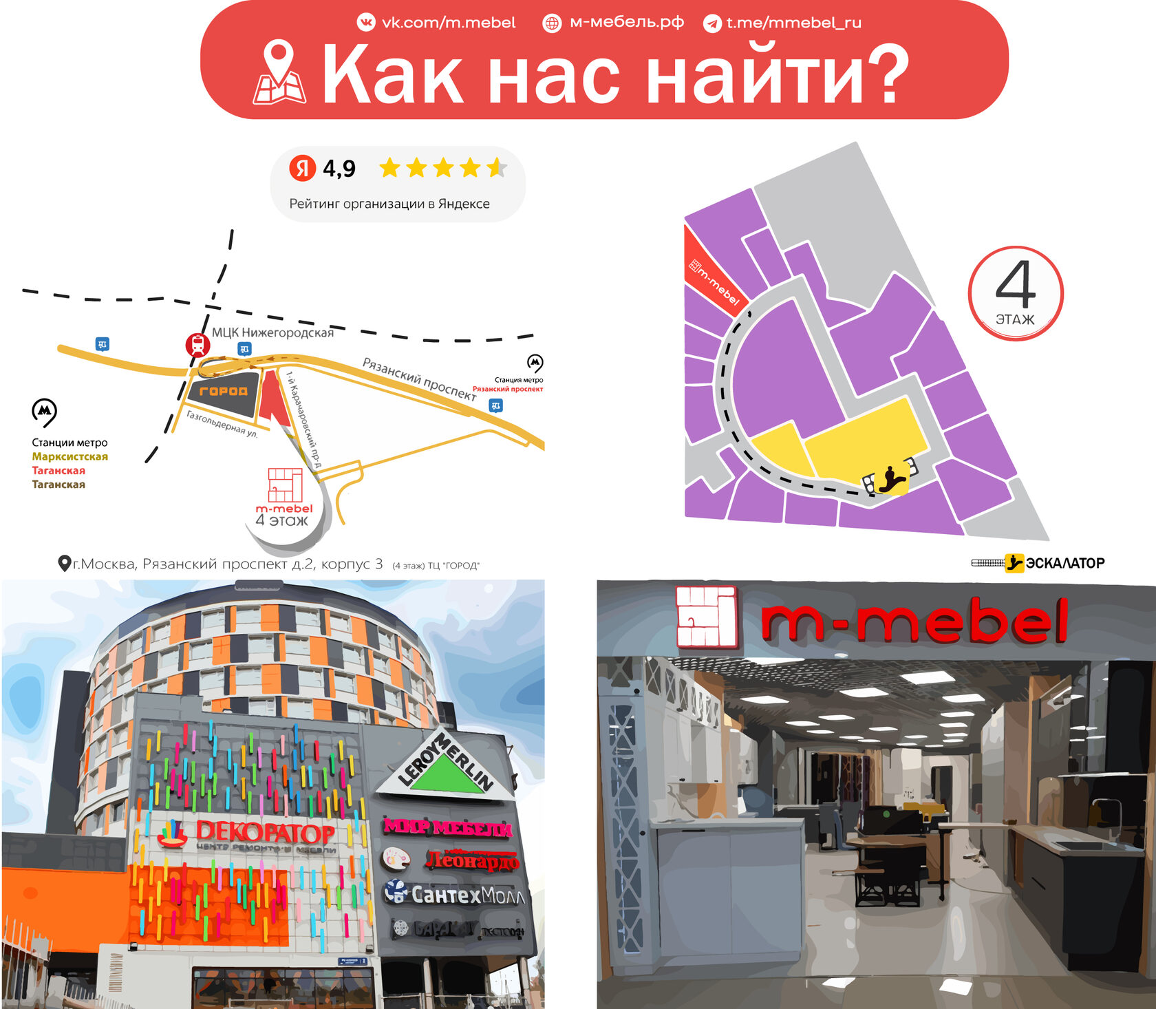 • Адрес: г.Москва, Рязанский проспект д.2, корпус 3. ТЦ "ГОРОД" • Телефон:+7 902 348-77-66 • Электронная почта: m.mebel.58@mail.ru Режим работы: понедельник - пятница, с 10:00 до 20:00, суббота - воскресенье, с 10:00 до 18:00.