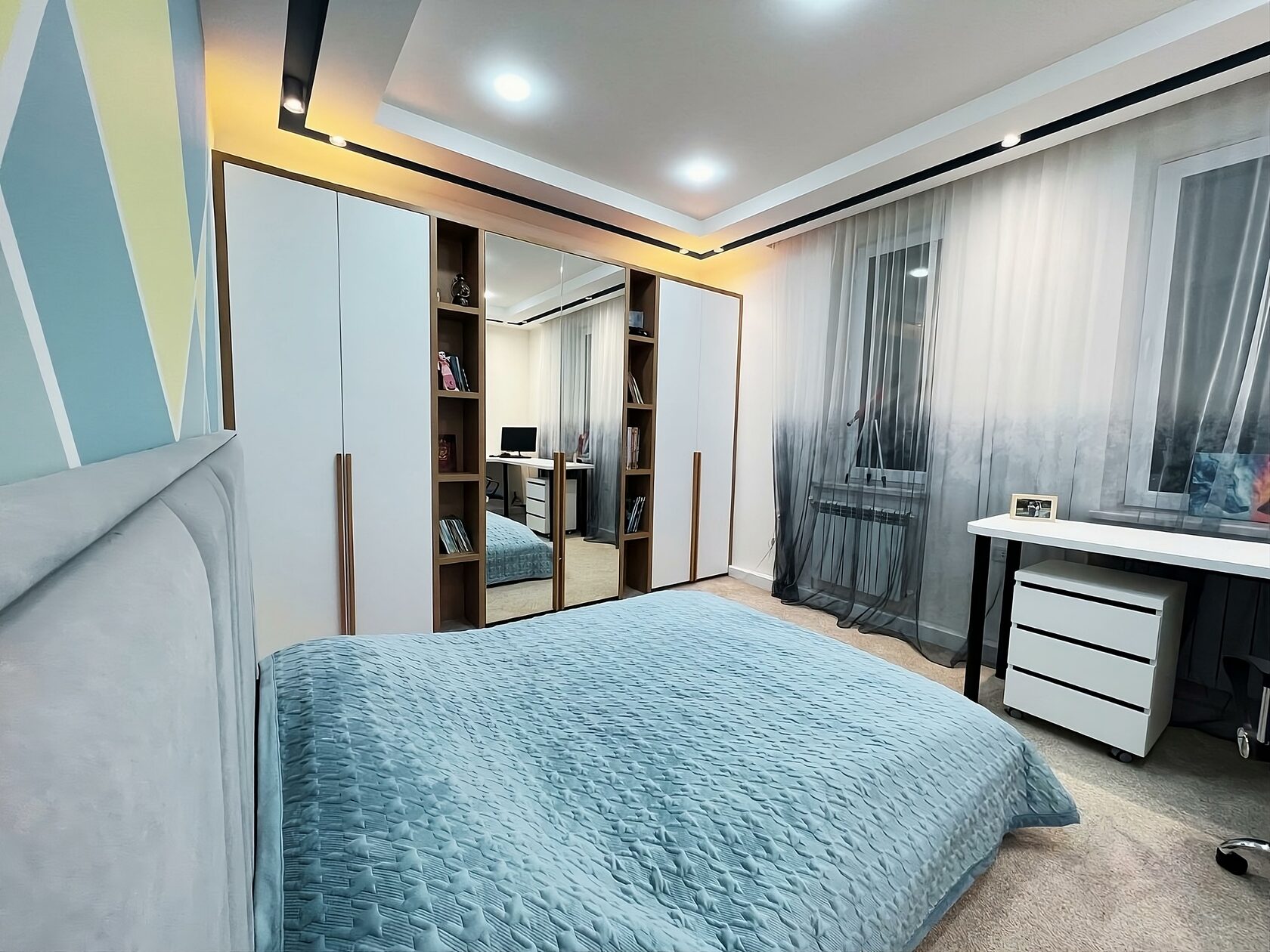 Размеры шкафа: ш. 1600 мм, в. 2600 мм, гл. 600 мм Размеры кровати: ш. 1600 мм, длинна 1860 мм, в. 450 мм Прикроватная тумба: ш. 300 мм, глубина 250 мм, в. 200 мм (МДФ в плёнке ПВХ) Анатомический матрас Erica Корпус: ЛДСП Увадрев Фасады: МДФ в плёнке ПВХ Фурнитура: Blum Ручки: Профиль голо, Tip on Подсветка: врезная
